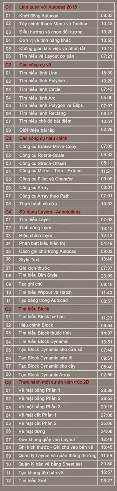 - Những năm gần đây Autocad liên tục được cập nhật những tính năng mới, giúp cho người dùng làm việc một cách nhanh hơn, dễ dàng hơn. Đặc biệt với phiên bản 2015 mới nhất hiện nay sẽ cho các bạn một trải nghiệm thú vị, nâng cao hiệu suất đáng kể đối với những phiên bản trước. Trong DVD Hướng dẫn Autocad 2015 chuyên đề về 2D, sẽ dẫn dắt các bạn từ lúc mới bắt đầu làm quen với Autocad 2015 cho đến tìm hiểu những tính năng nâng cao để có thể phục vụ cho việc thiết kế kiến trúc và xây dựng. Video hướng dẫn hoàn toàn bằng tiếng Việt với chất lượng Full HD 1080p, hình ảnh trực quan chắc chắn giúp các bạn tiếp thu một cách nhanh nhất.