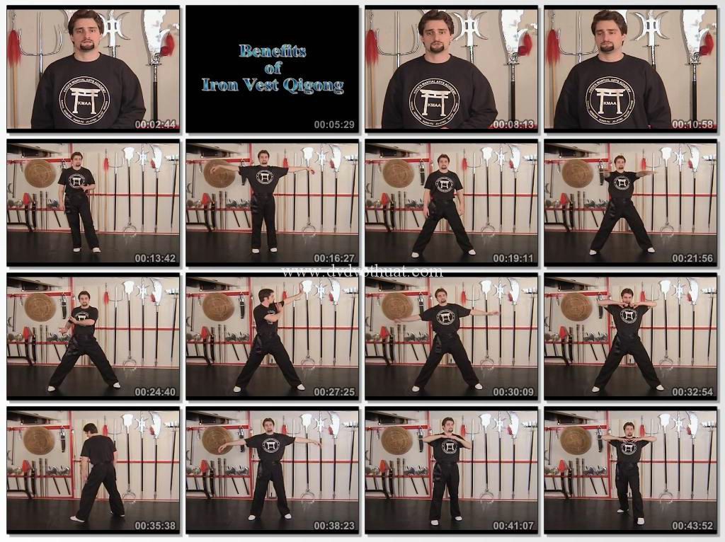 Iron Vest Qigong is a high level internal strength and health exercise set centuries old. Iron Vest, also known as Iron Shirt or Iron Jacket has a variety of benefits both for martial artists and those who are interested in overall health of the body. Iron Vest was used to protect people from injury during combat. The purpose of Iron Vest for martial artists is to strengthen the chi or internal energy of the body. Iron Vest is designed to increase and strengthen the chi that circulates in and around the internal organs to strengthen and protect them. For those who are not involved in the martial arts but would like to receive the benefits of Iron vest, you should expect to see an increase in your muscular endurance when performong aerobics or weight training. An improved sense of balance and posture throughout the body as well as healing and prevention of lower back injuries. This exercise program is designed to be practiced daily in as little as 15 minutes. For those wishing to train the entire series and receive full benefit for use in full contact fighting, training is a minimum of 3 years with daily practice of 75 to 90 minutes. This video is not meant to replace instruction from a qualified instructor